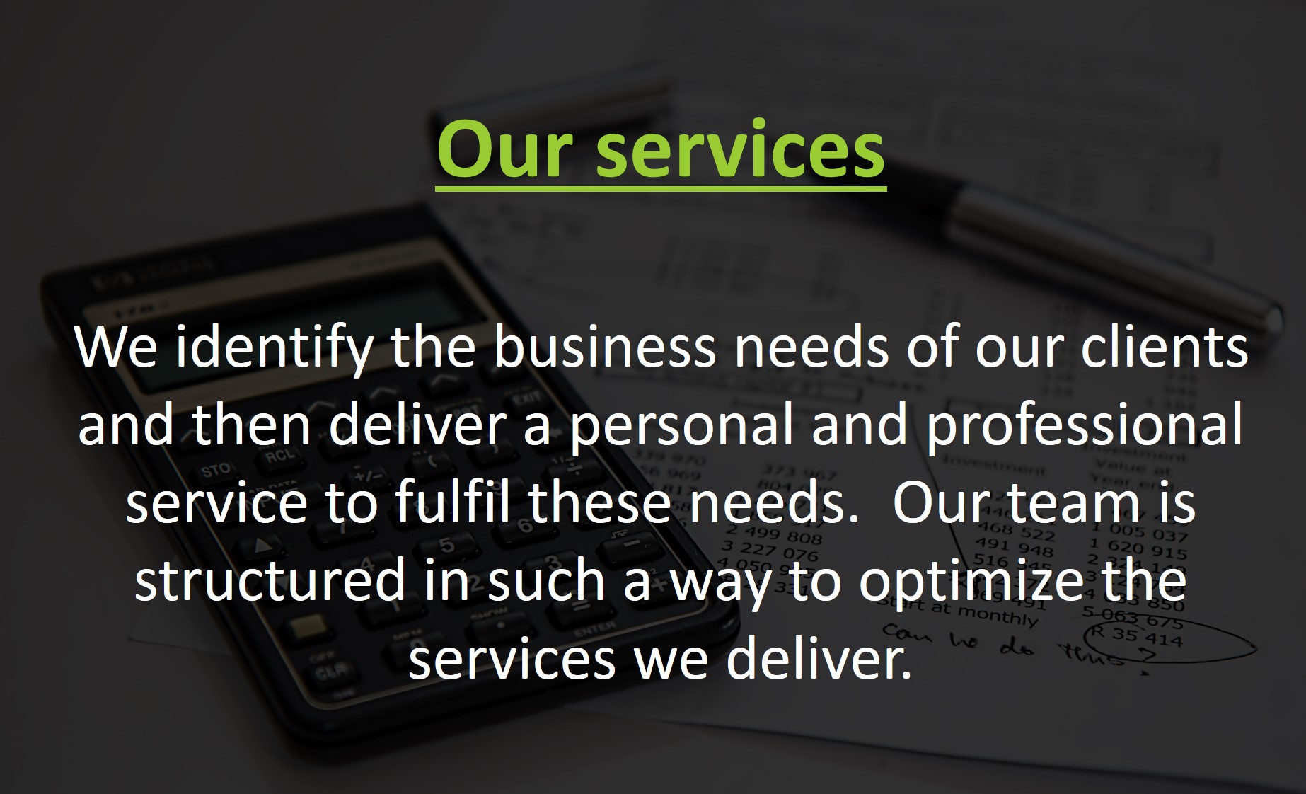 We are Professional Accountants and Tax Consultants providing Accounting and tax services to our client. We provide services to Small- and Medium Businesses defined by our values.
